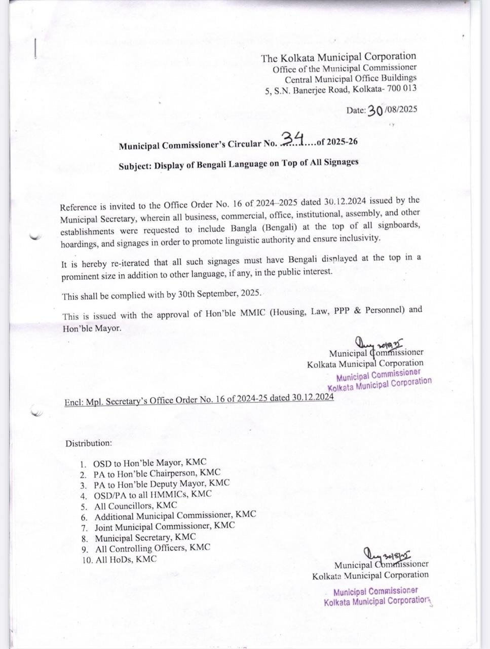 कोलकाता नगर निगम (केएमसी) ने शहर के सभी व्यवसायिक और वाणिज्यिक प्रतिष्ठानों को एक बार फिर निर्देश जारी किया है कि वे अपने साइनबोर्ड, होर्डिंग्स और साइनेज पर बंगाली भाषा को शामिल करें. ये कदम बंगाली भाषा के प्रभुत्व को बढ़ावा देने और समावेशिता सुनिश्चित करने के उद्देश्य से उठाया गया है.
