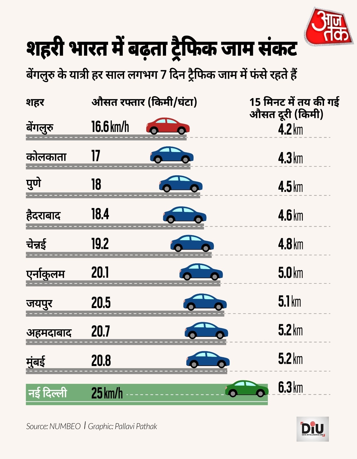 नम्बेओ के आंकड़ों के मुताबिक, साल 2025 में बेंगलुरु में 15 मिनट में सिर्फ 4.2 किलोमीटर की दूरी तय हो पाती है. यानी औसत रफ्तार 16.6 किलोमीटर प्रति घंटा है. इस सूची में कोलकाता दूसरे नंबर पर है, जहां 15 मिनट में 4.3 किलोमीटर की दूरी तय होती है और औसत स्पीड 17 किलोमीटर प्रति घंटा है. पुणे में 15 मिनट में 4.5 किलोमीटर की दूरी तय होती है, जहां औसत रफ्तार 18 किलोमीटर प्रति घंटा है.