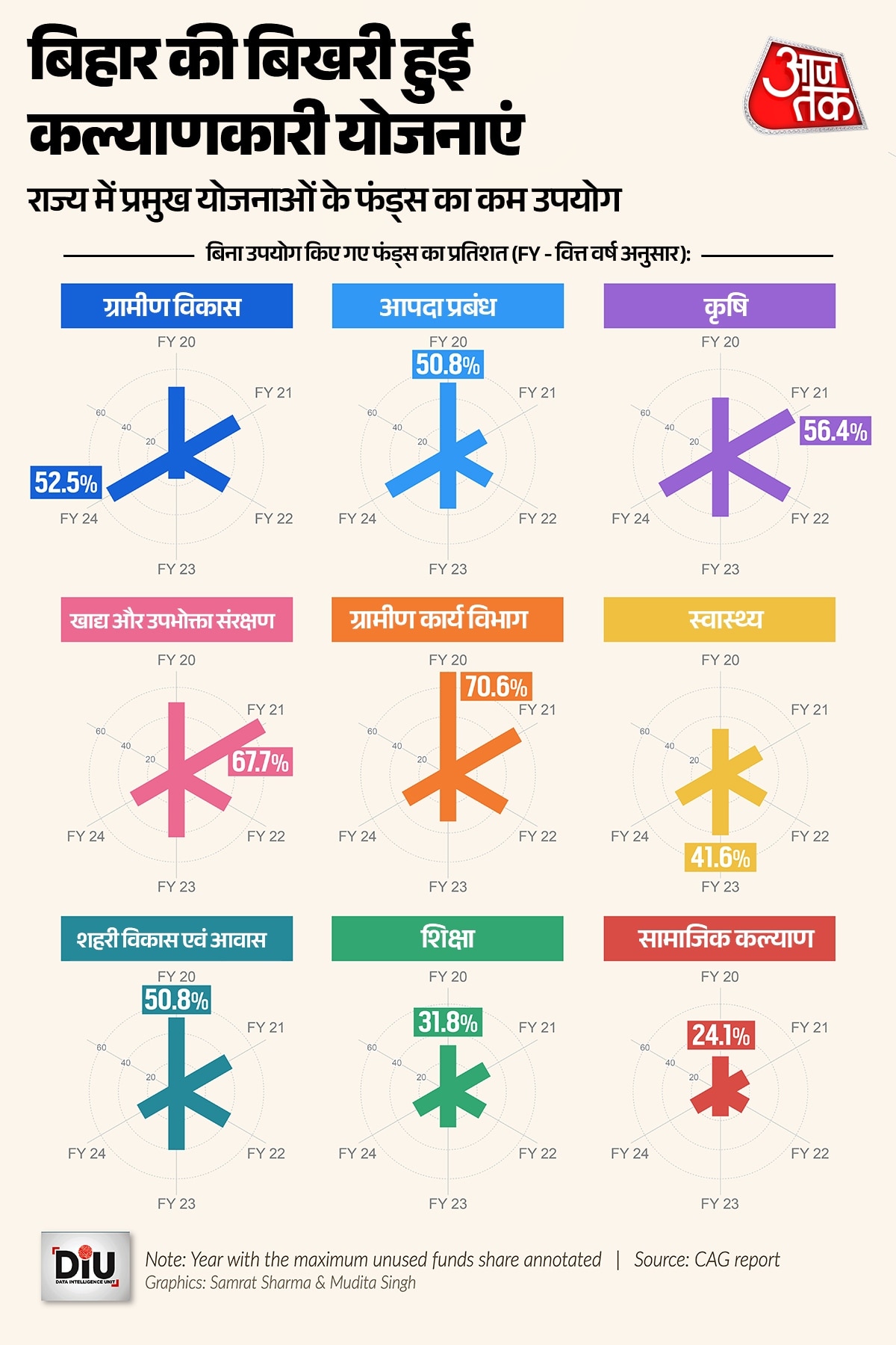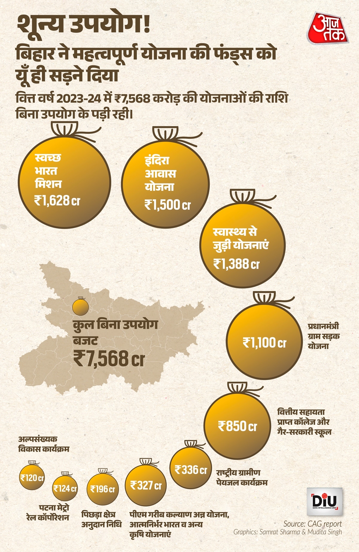 बिहार में चुनाव का माहौल है और हर बार की तरह नेता बड़े-बड़े वादे कर रहे हैं. इस बीच सवाल ये उठ रहा है कि अगर ये वादे पूरे भी हो गए तो क्या योजनाओं के लिए आवंटित पैसा वाकई इस्तेमाल हो रहा है? कॉम्पट्रोलर एंड ऑडिटर जनरल ऑफ इंडिया (CAG) की एक ताजा रिपोर्ट में खुलासा हुआ है कि 2023-24 में 20 योजनाओं के लिए 7,567.93 करोड़ रुपये का बजट पूरी तरह से इस्तेमाल नहीं हुआ.
