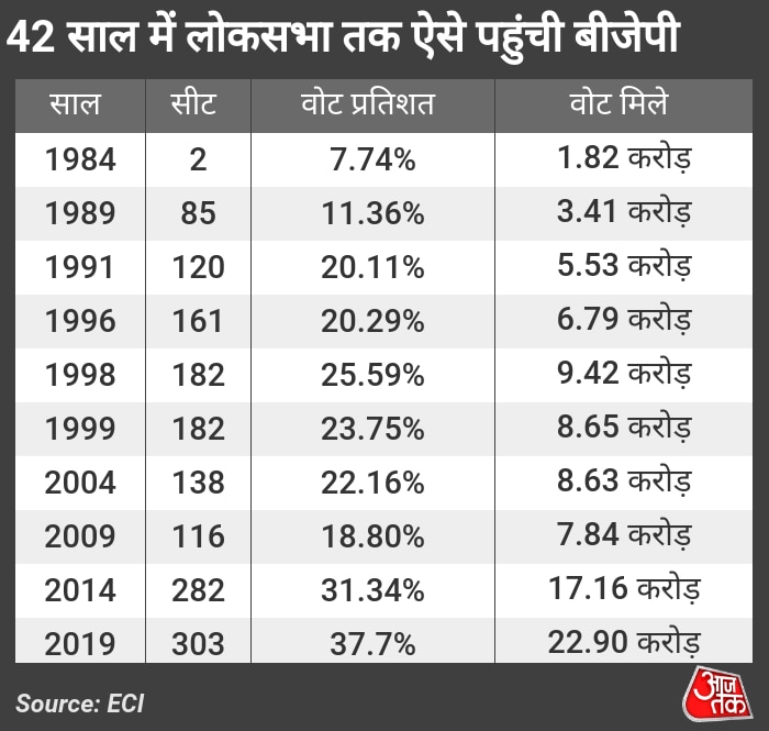 इन चार दशकों में बीजेपी ने 2 सीटों से लेकर 303 सीटों का सफर तय किया है. अपने पहले चुनाव में बीजेपी को 1.82 करोड़ वोट मिले थे, जबकि 2019 के आम चुनाव में बीजेपी 22.90 करोड़ से ज्यादा वोट हासिल किए.