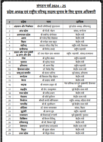 भारतीय जनता पार्टी ने राज्यों में होने वाले प्रदेश अध्यक्षों और नेशनल काउंसिल मेंबर्स के चुनाव के लिए चुनाव प्रभारियों की नियुक्ति कर दी है. पार्टी ने 15 जनवरी तक प्रदेश अध्यक्षों का चुनाव करने का ऐलान किया है. पार्टी ने अपने कई कद्दावर नेताओं को यूपी, गुजरात, बिहार जैसे अहम प्रदेशों की जिम्मेदारी सौंपी हैं.