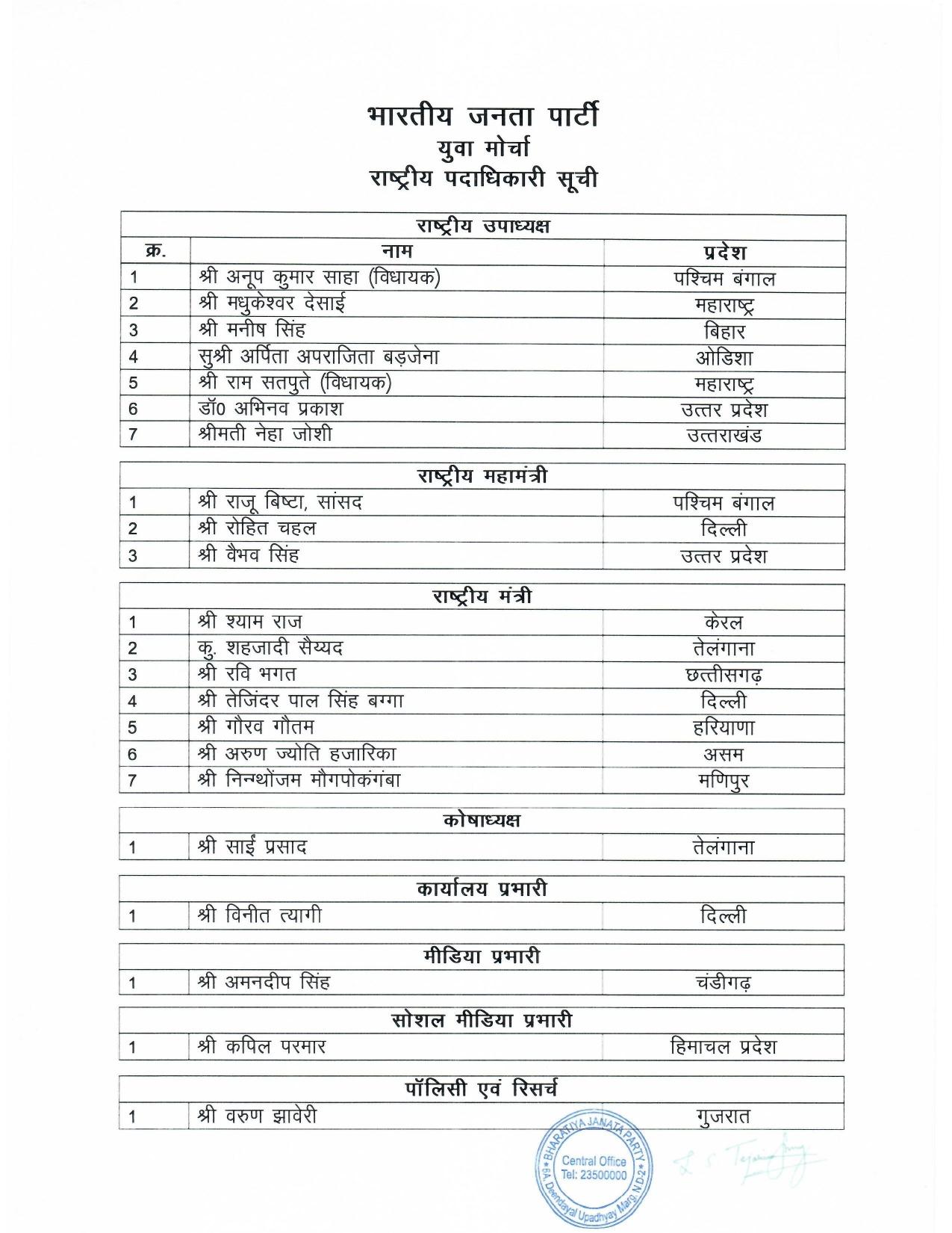 बीजेपी युवा मोर्चा के अध्यक्ष तेजस्वी सूर्या ने आज बुधवार को पार्टी के राष्ट्रीय अध्यक्ष जेपी नड्डा की सहमति के बाद नए पदाधिकारियों की लिस्ट जारी की है. बंगाल से विधायक अनपू साहा और महाराष्ट्र से विधायक राम सतपुते को राष्ट्रीय उपाध्यक्ष के रूप में जिम्मेदारी दी गई है.