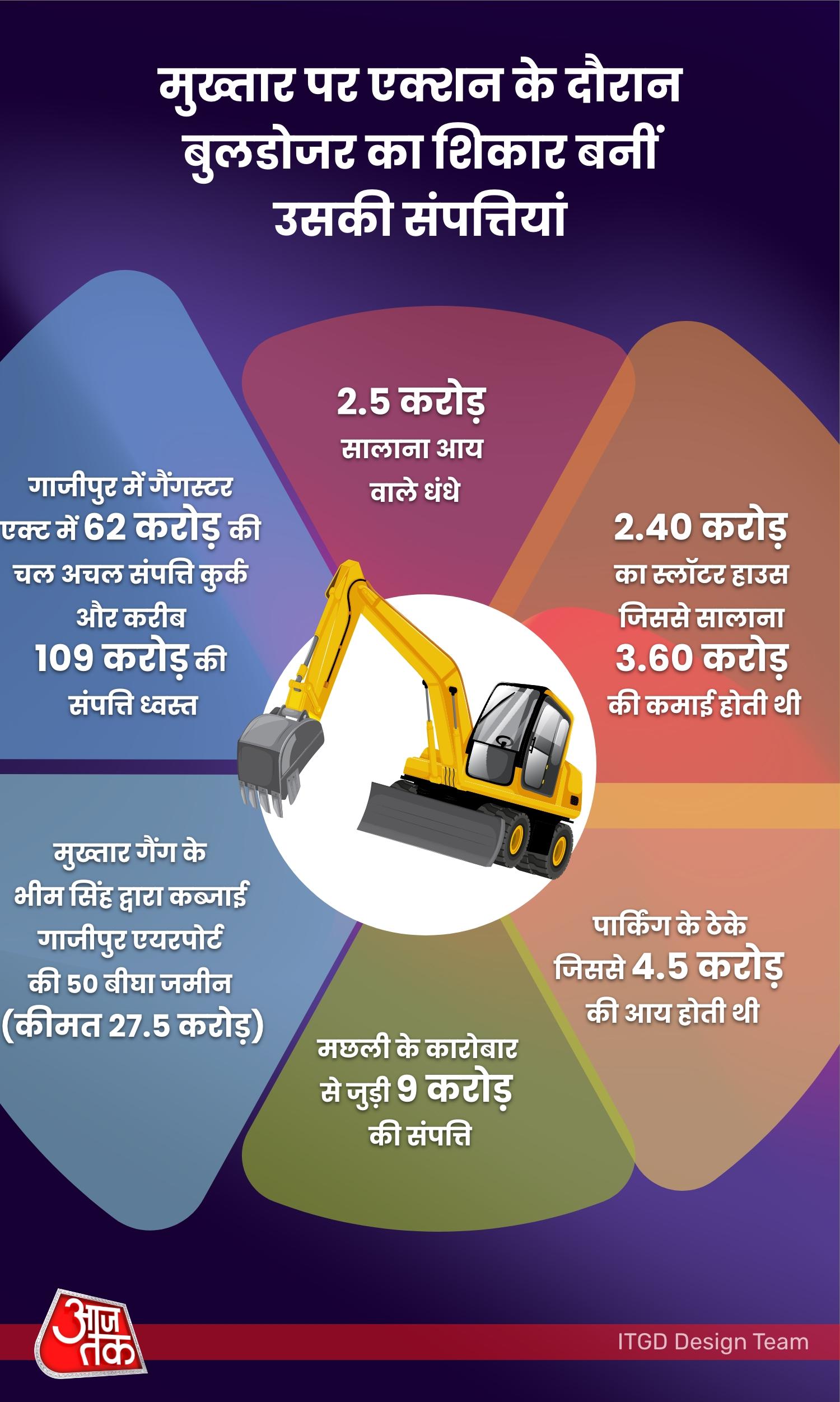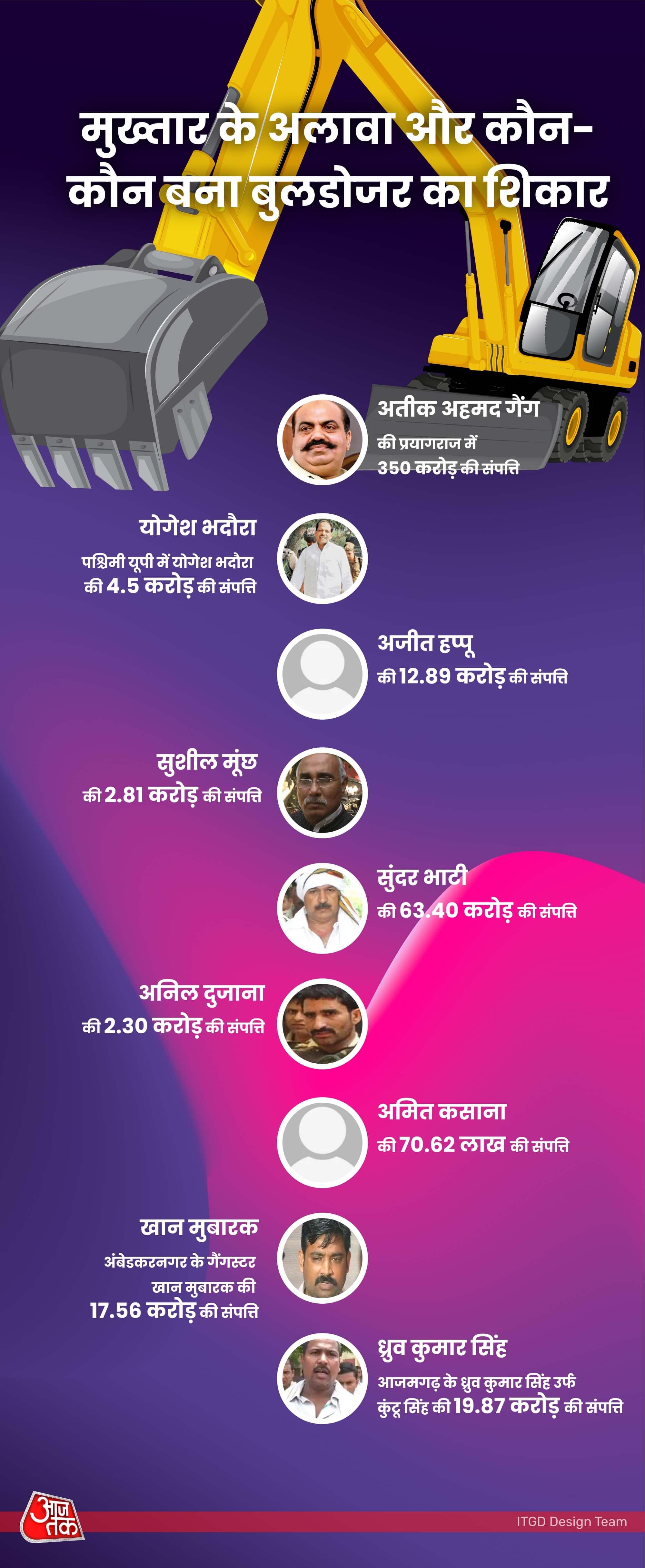 यूपी में सबसे ज्यादा बुलडोजर मुख्तार अंसारी और उसकी गैंग की संपत्तियों पर चला. मुख्तार और उससे जुड़े लोगों की करीब 393 करोड़ की संपत्ति पर बुलडोजर चला. ये कार्रवाई गैंगस्टर एक्ट के तहत हुई.