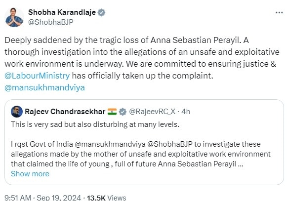 मंत्री करंदलाजे भाजपा नेता राजीव चंद्रशेखर के एक पोस्ट का जवाब दे रही थी, जिन्होंने अन्ना की मौत को बहुत दुखद और "कई स्तरों पर परेशान करने वाला" बताया था. पूर्व केंद्रीय मंत्री ने अर्न्स्ट एंड यंग इंडिया से अपनी कंपनी के टॉक्सिक वर्क कल्चर की जांच करने की भी मांग की थी.