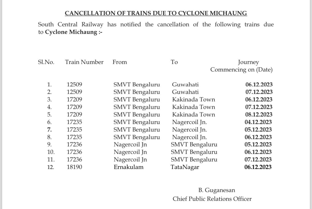 • 03 और 4 दिसंबर 2023 को एमजीआर चेन्नई सेंट्रल से चलने वाली ट्रेन संख्या 12656 एमजीआर चेन्नई सेंट्रल-अहमदाबाद नवजीवन एक्सप्रेस निरस्त रहेगी. इनके अलावा भी कई ट्रेनें रद्द कर दी गई हैं.