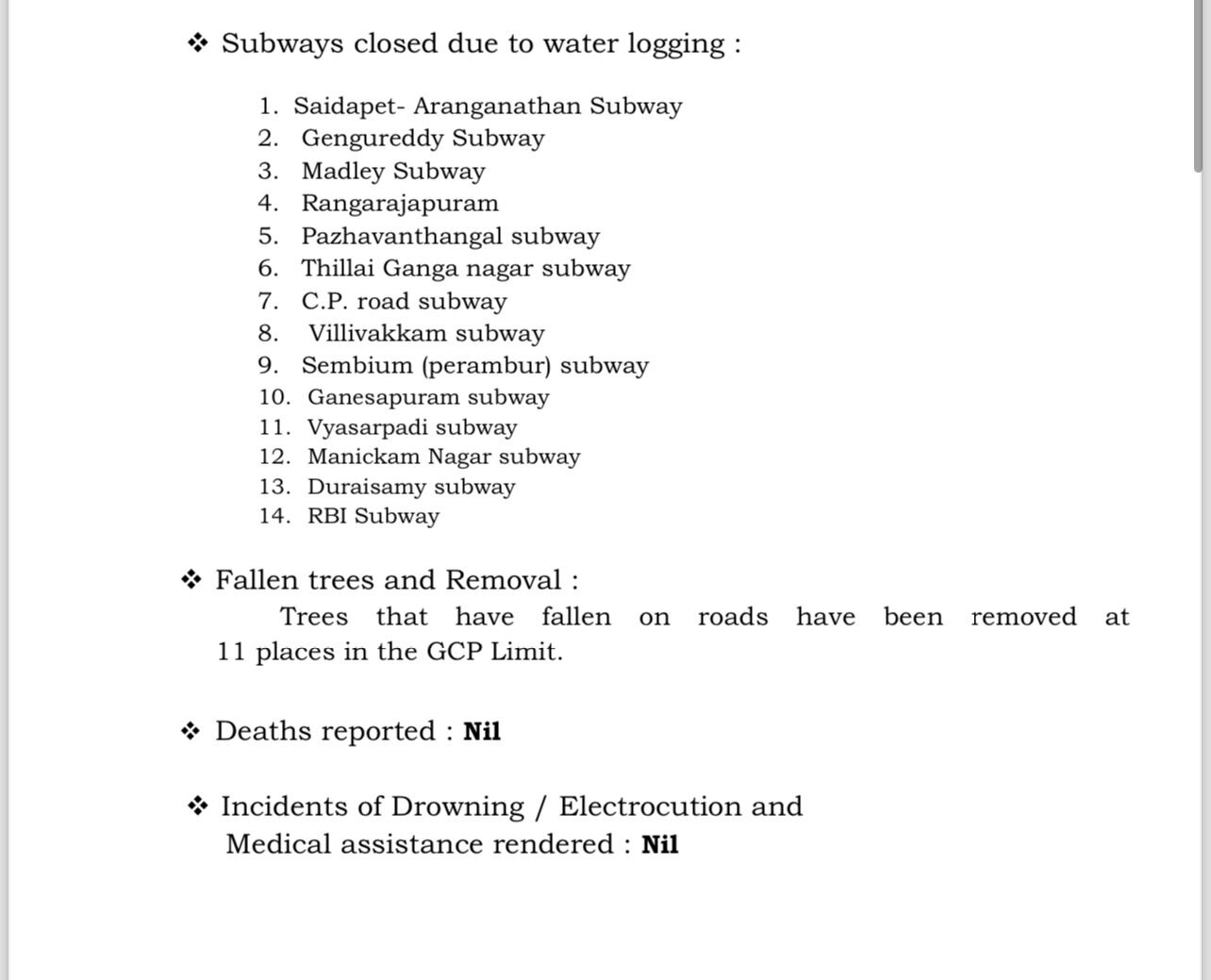 भारी बारिश और तेज हवाओं के कारण चेन्नई हवाई अड्डे पर फ्लाइट्स प्रभावित हैं. कई उड़ानें रद्द कर दी गई हैं और कुछ अन्य का मार्ग परिवर्तित कर दिया गया. वहीं, भारी बारिश और जलजमाव के कारण सभी चेन्नई उपनगरीय खंडों में उपनगरीय ट्रेन सेवाओं को अस्थायी रूप से आज (4 दिसंबर) 08.00 बजे तक निलंबित कर दिया गया है. वहीं, जलभराव के कारण शहर के 14 सबवे यातायात के लिए बंद कर दिए गए हैं. तेज हवाओं के कारण गिरे 11 पेड़ों को अब तक हटाया जा चुका है.