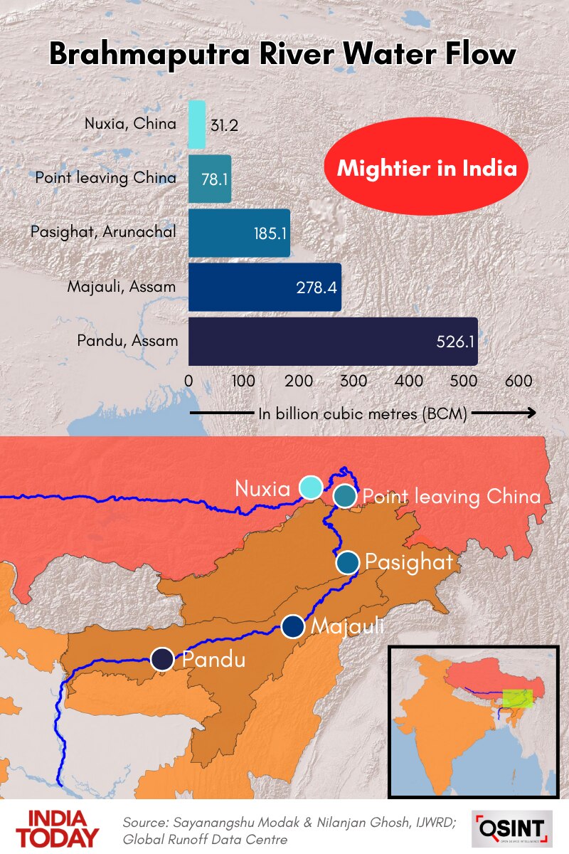 डेटा देखें तो भारत में प्रवेश करने के बाद नदी का वार्षिक औसत प्रवाह काफी बढ़ जाता है, जो इस बात की तरफ संकेत करता है कि इसके प्रमुख जलस्रोत भारत में अधिक हैं. चीन जिस जगह पर सुपर डैम का निर्माण कर रहा है, वहां से कुछ सौ किलोमीटर की दूरी पर ऊपर तिब्बत के नुक्सिया में प्रवाह 31 बिलियन क्यूबिक मीटर (बीसीएम) रहता है. नदी जब चीन से निकलती है, तब इसका प्रवाह 78 बीसीएम रहता है, जो अरुणाचल प्रदेश के पासीघाट में 185 बीसीएम पहुंच जाता है. गुवाहाटी पहुंचते-पहुंचते ब्रह्मपुत्र का प्रवाह 526 बीसीएम तक बढ़ जाता है.