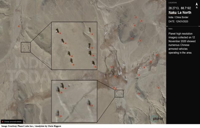 इस स्थान के बारे में नवंबर 2020 में स्पेस फर्म प्लैनेट लैब्स द्वारा ली गई हाई रिज़ॉल्यूशन की सैटेलाइट इमेज महत्वपूर्ण डिटेल प्रदान करती हैं. पीएलए बख्तरबंद वाहनों की एक संभावित बटालियन की तैनाती भी उत्तर की ओर देखी गई.
