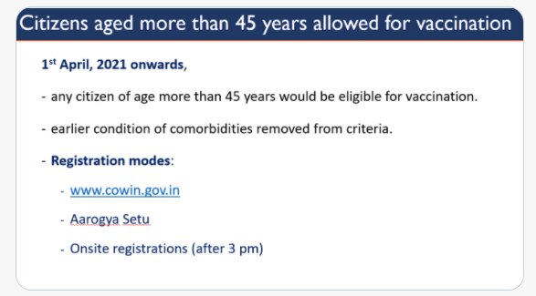 राष्ट्रीय स्वास्थ्य सचिव ने ट्विट कर यह जानकारी दी थी कि 1 अप्रैल से 45 वर्ष से अधिक आयु के सभी लोग टीकाकरण के लिए पात्र होंगे. http://cowin.gov.in के माध्यम से ऑनलाइन बुकिंग की जा सकती है. ऑफलाइन करने के लिए दोपहर 3 बजे के बाद अपने नजदीकी टीकाकरण केंद्र पर जाकर ऑन-साइट पंजीकरण कर सकते हैं.