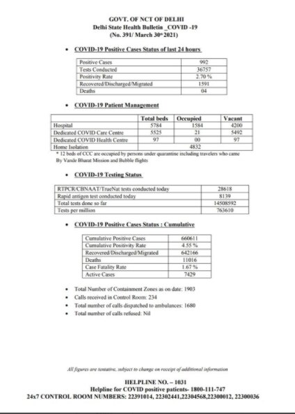 सत्येंद्र जैन, स्वास्थ्य मंत्री दिल्ली ने यह रिपोर्ट दी है कि कल दिल्ली में 1904 नए मामले आए हैं. पॉजिटिविटी रेट 2.77 है. उन्होंने बताया कि जागरूकता लाई जा रही है और इसे लहर कहने में एक सप्ताह का समय लग सकता है. बिस्तरों की समीक्षा की जाएगी.