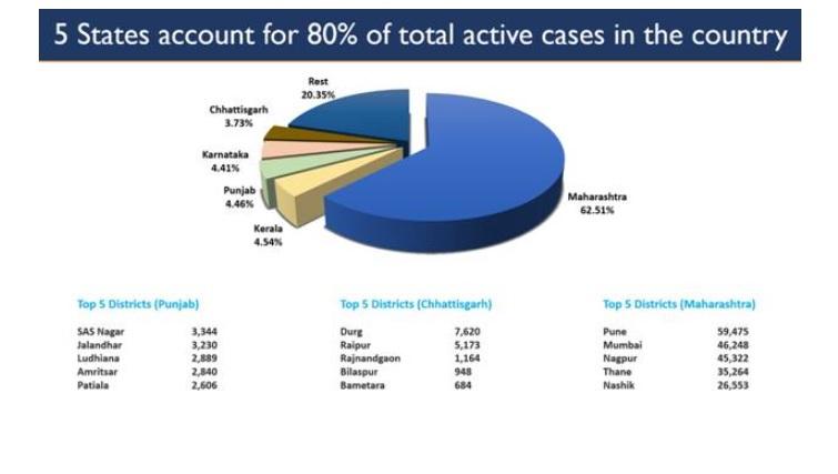 देश के कुल सक्रिय मामलों का 79.64% महाराष्ट्र, केरल, पंजाब, कर्नाटक और छत्तीसगढ़ में है. अकेले महाराष्ट्र मे 62% से अधिक एक्टिव केस हैं.