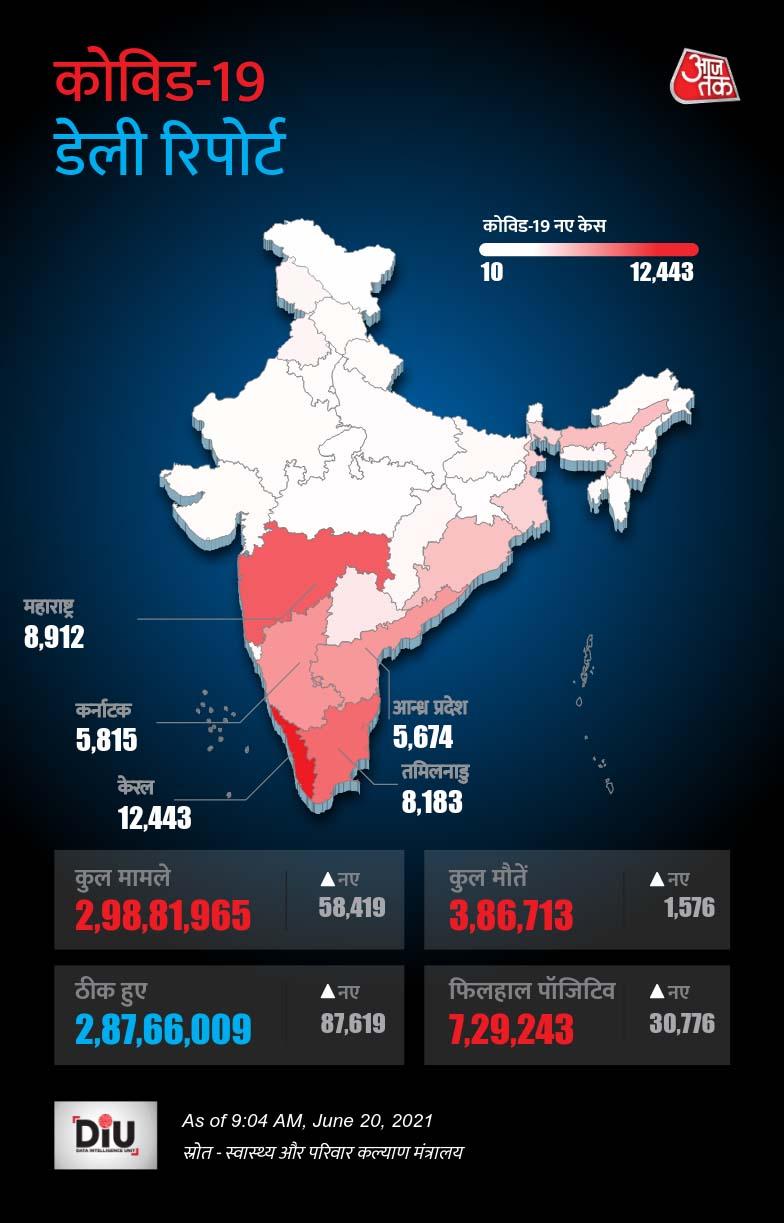 केंद्रीय स्वास्थ्य मंत्रालय (Health Ministry of India) के मुताबिक देश में बीते 24 घंटे में कोरोना के 58,419 नए मामले सामने आए हैं, जो 81 दिन के बाद 60 हजार से कम केस हैं. जबकि इस दौरान 87,619 कोरोना मरीज ठीक/रिकवर हुए हैं. वहीं, बीते एक दिन में 1576 कोविड मरीजों की मौत हुई है. भारत में फिलहाल 7 लाख 29 हजार कोरोना के एक्टिव केस हैं. केंद्रीय स्वास्थ्य मंत्रालय द्वारा रविवार (20 जून 2021) सुबह 8 बजे जारी किए गए कोरोना के आंकड़े....