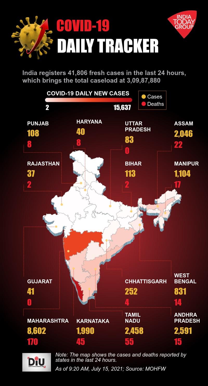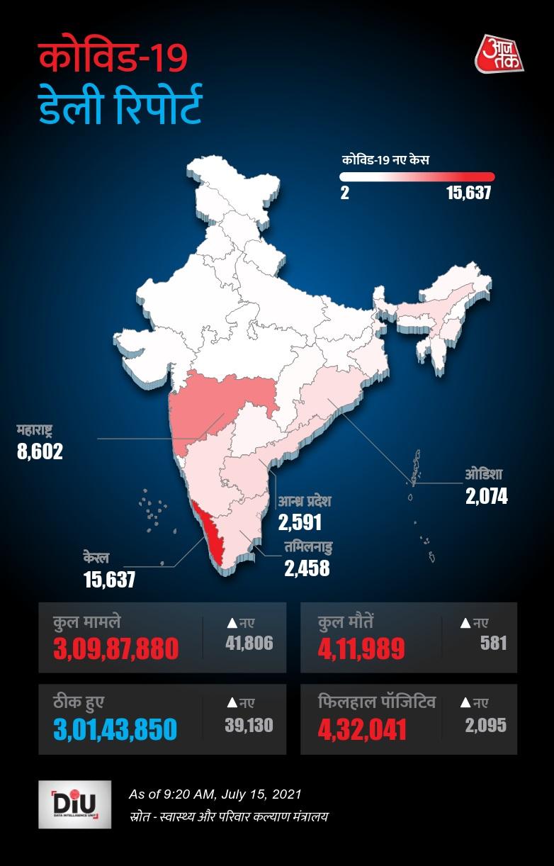 Coronavirus In India Today Updates: देश में कोरोना वायरस के नए मामलों के आंकड़ें लगातार 50 हजार से नीचे बने हुए हैं. लेकिन केरल और महाराष्ट्र में कोरोना के आंकड़े कम होने का नाम नहीं ले रहे हैं. कुल नए मामलों का 37.4 फीसदी हिस्सा अकेले केरल में दर्ज किया गया है. स्वास्थ्य मंत्रालय द्वारा गुरुवार सुबह जारी आंकड़ों के मुताबिक देश में कोरोना के 41,806 नए मामले दर्ज किए गए हैं. साथ ही 581 मरीजों ने पिछले 24 घंटे में दम तोड़ दिया है.