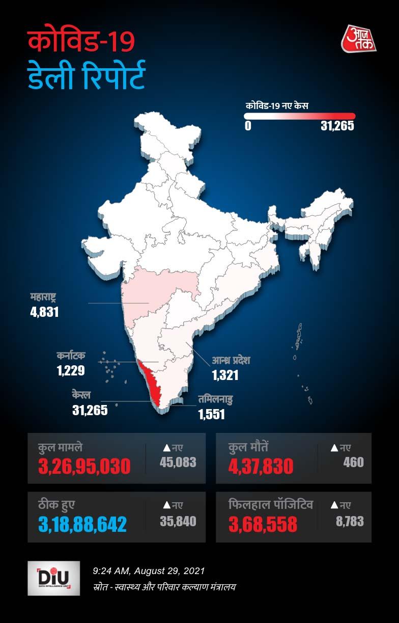 केंद्रीय स्वास्थ्य मंत्रालय के आज (रविवार) यानी 29 अगस्त 2021 की सुबह जारी आंकड़ों के अनुसार, बीते 24 घंटे में 460 कोरोना मरीजों की मौत के बाद मृतकों की संख्या बढ़कर 4,37,830 हो गई है. वहीं, देश में एक्टिव मरीजों की संख्या बढ़कर 3,68,558 हो गई है. मरीजों के ठीक होने की राष्ट्रीय दर घटकर 97.53 प्रतिशत पहुंच गई है. देखें कोरोना के ताजा आंकड़े..