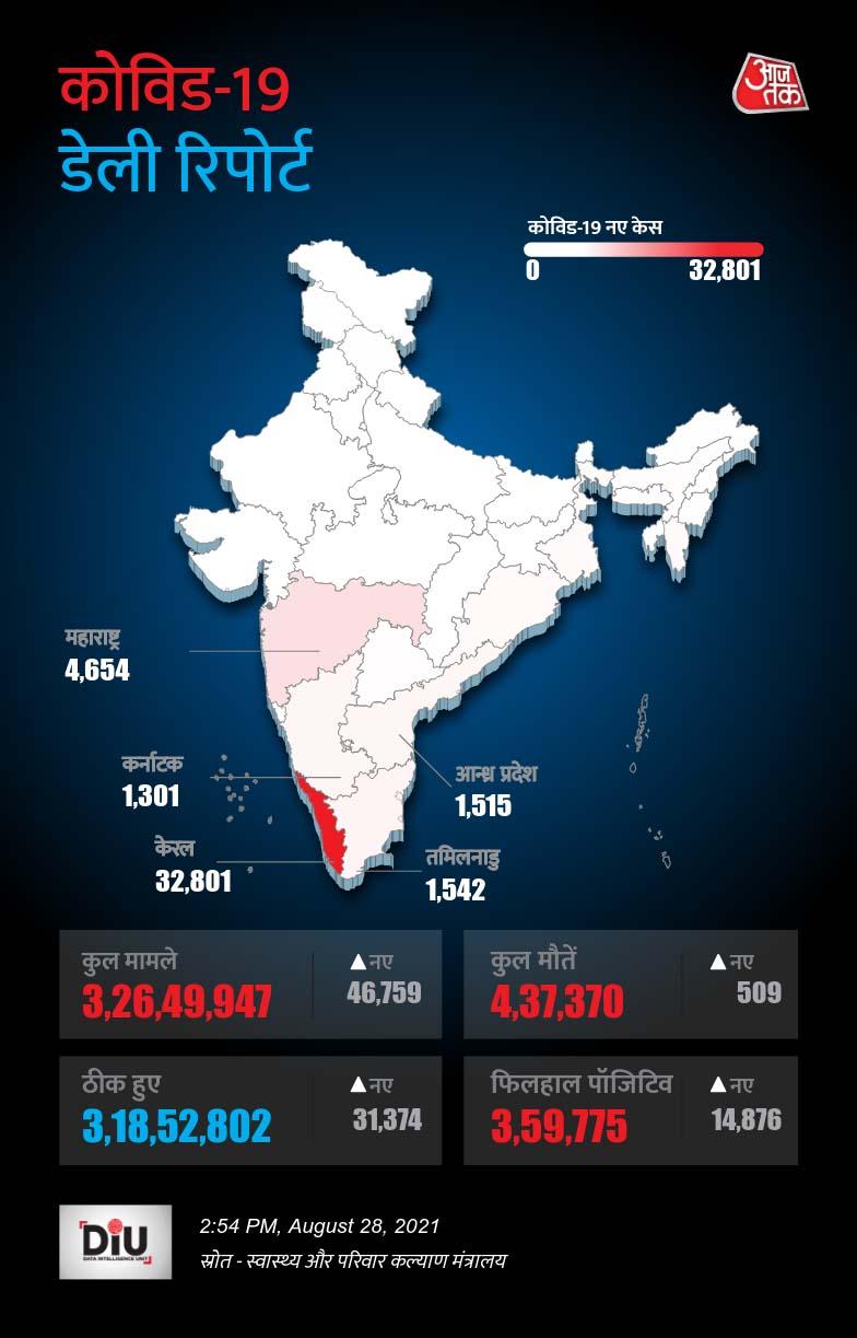 देश में कोरोना मरीजों के ठीक होने की दर यानी रिकवरी रेट (Recovery Rate) की तुलना में पॉजिटिविटी रेट (Positivity Rate) में इजाफा हुआ है. जिससे कोरोना संक्रमितों का आंकड़ा एक बार फिर बढ़ने लगा है. भारत में फिलहाल कोरोना के 3,59,775 एक्टिव केस हैं. जबकि अब तक कुल 3,18,52,802 कोरोना मरीज इस महामारी को मात देकर अब तक ठीक हो चुके हैं. केंद्र सरकार की ओर से आज (शनिवार) यानी 28 अगस्त की सुबह जारी कोरोना के ताजा आंकड़े...