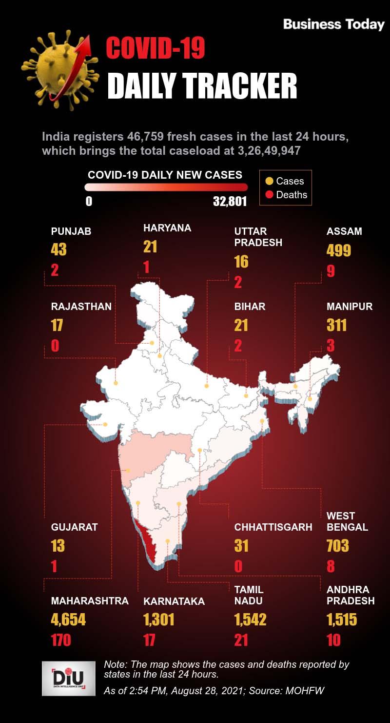 केंद्रीय स्वास्थ्य मंत्रालय के अनुसार भारत में बीते 24 घंटे में COVID-19 के 46,759 नए मामले सामने आए हैं. जबकि इस दौरान 31,374 कोरोना मरीज डिस्चार्ज/ठीक हुए हैं. इसके अलावा बीते एक दिन में 509 कोविड मरीजों ने दम तोड़ा है.