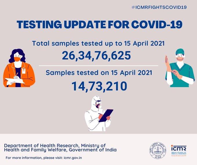 ICMR के अनुसार, देश में अभी तक कोरोना वायरस के लिए 26,34,76,625 टेस्ट हुए हैं. कल यानी 15 अप्रैल को 14,73,210 टेस्ट हुए.