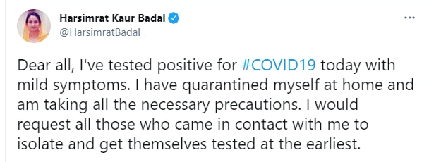 शिरोमणि अकाली दल की नेता हरसिमरत कौर बादल कोरोना वायरस से संक्रमित पाई गई हैं. उन्होंने ट्वीट कर इसकी जानकारी दी है. उन्होंने बताया कि उन्हें हल्के लक्षण हैं और उन्होंने खुद को घर पर क्वारंटीन कर लिया है.