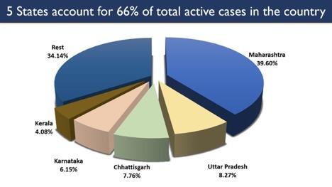 देश के 66% सक्रिय मामले सिर्फ 5 राज्यों से हैं. ये 5 राज्य हैं- महाराष्ट्र, उत्तर प्रदेश, छ्त्तीसगढ़, कर्नाटक और केरल. महाराष्ट्र में सबसे ज्यादा 39.60% एक्टिव केस हैं.