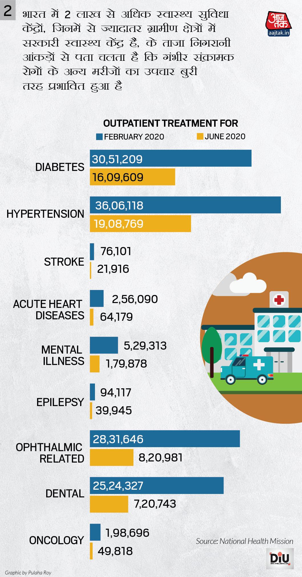 ज्यादातर बीमारियों के लिए जून में ओपीडी में जो उपस्थिति दर्ज की गई, जनवरी के मुकाबले वह 50% भी नहीं है. इसका मतलब ये हो सकता है कि ग्रामीण भारत में गंभीर बीमारी वाले मरीजों को पिछले कई महीने से उचित इलाज नहीं मिल पा रहा है.
