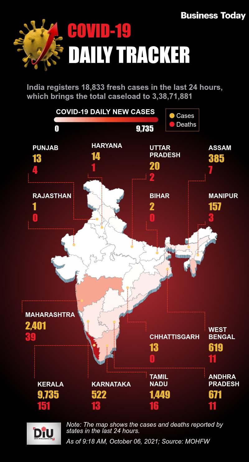 Coronavirus in India Latest Updates: भारत में कोरोना के एक्टिव मरीजों की संख्या अब ढाई लाख से कम है. देश में बीते सप्ताह से कोरोना के 20 हजार से नीचे नए केस सामने आने के साथ रिकवरी रेट तेजी से बढ़ा है. ताजा आंकड़ों के मुताबिक देश में पिछले 24 घंटे में कोविड-19 के 18,833 नए मरीजों की पुष्टि होने के साथ संक्रमण के कुल मामलों की संख्या 3,38,71,881 पहुंच गई है.