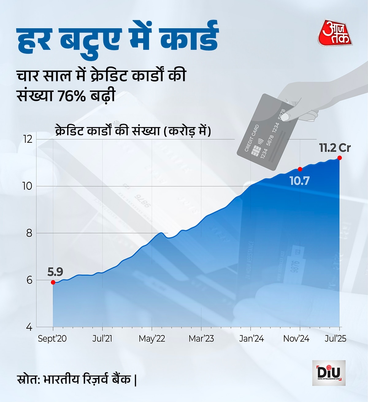 इस उछाल की बड़ी वजह sheer volume है. RBI के Database on Indian Economy के मुताबिक, जुलाई 2021 में देश में 6.34 करोड़ क्रेडिट कार्ड चलन में थे, जो जुलाई 2025 में बढ़कर 11.16 करोड़ हो गए. यानी सीधे सीधे 76% की बढ़ोतरी हुई. सिर्फ कार्ड ही नहीं बढ़े, बल्कि हर कार्ड पर लिया जाने वाला उधार भी बढ़ा है. 2021 के बीच में प्रति कार्ड औसत बकाया लगभग ₹20,900 था, जो जुलाई 2025 में बढ़कर ₹26,100 हो गया है. यानी इसमें भी 25% की बढ़ोतरी हो गई.
