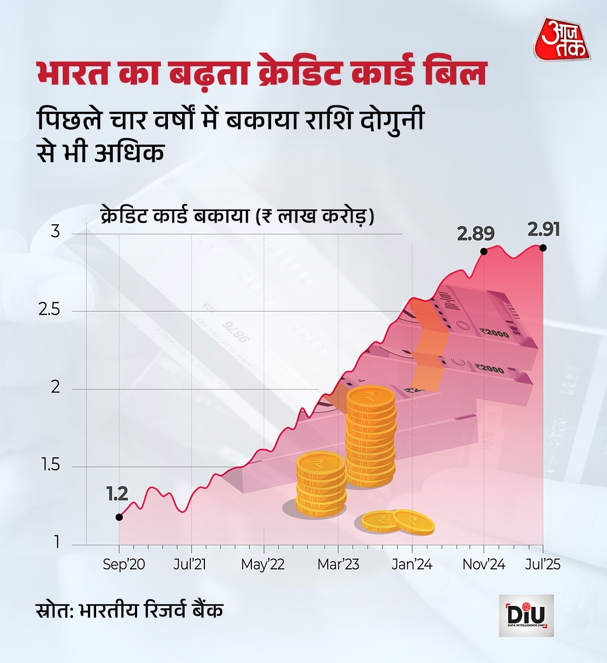 भारत का क्रेडिट कार्ड बिल इतनी तेजी से बढ़ रहा है कि इसे अनदेखा करना मुश्किल है. भारतीय रिजर्व बैंक (RBI) के ताजा आंकड़े बताते हैं कि जुलाई 2025 तक बकाया क्रेडिट कार्ड कर्ज ₹2.91 लाख करोड़ तक पहुंच गया है. जुलाई 2021 में यह ₹1.32 लाख करोड़ था. यानी सिर्फ 4 साल में क्रेडिट कार्ड का कर्ज 2.2 गुना हो गया है.