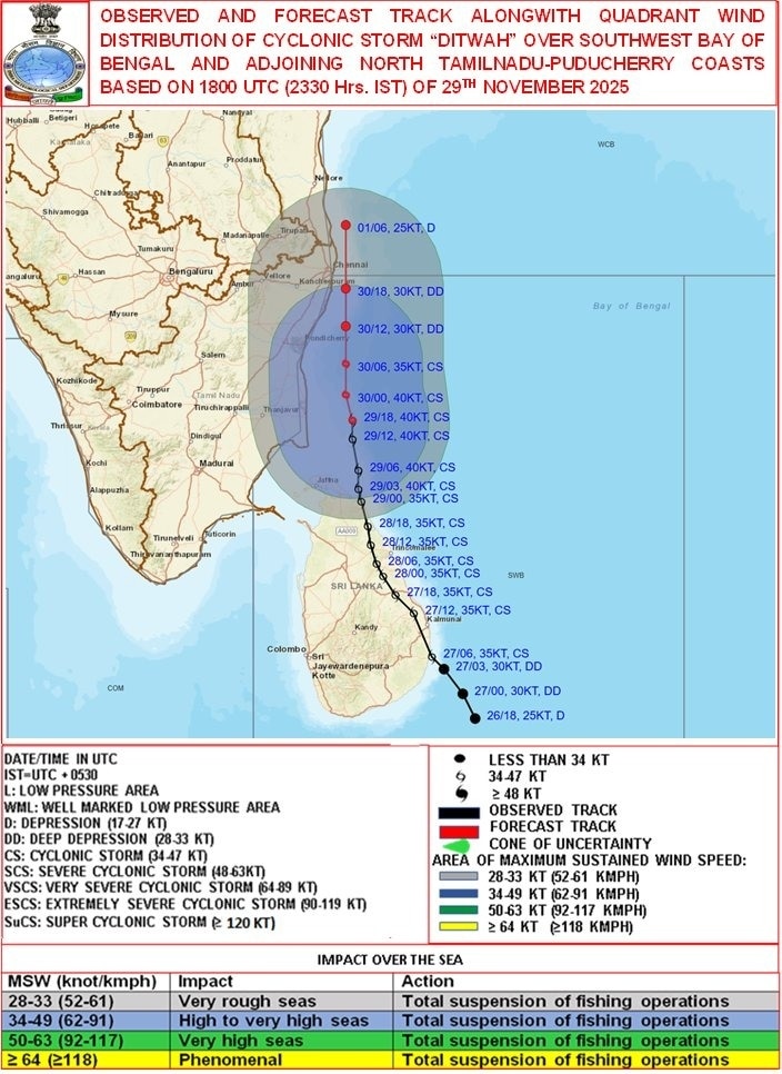 चक्रवात दित्वाह पिछले 6 घंटों में लगभग 5 किलोमीटर प्रति घंटा की रफ्तार से उत्तर की ओर बढ़ा और 29 नवंबर की रात 11:30 बजे इसका केंद्र दक्षिण पश्चिम बंगाल की खाड़ी और उत्तर तमिलनाडु–पुडुचेरी तट के पास अक्षांश 10.7N और देशांतर 80.6E पर स्थित था.