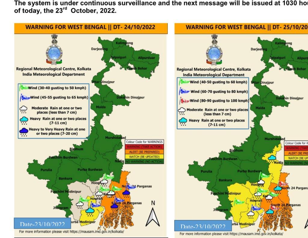 सितरंग तूफान की वजह से पश्चिम बंगाल के उत्तर और दक्षिण 24 परगना में दिवाली पर भारी बारिश होने की संभावना है. मौसम विभाग ने तूफान की वजह से ही कोलकाता, हावड़ा, हुगली पूर्वी मिदनापुर, उत्तर और दक्षिण 24 परगना में 25 अक्टूबर को भारी बारिश की चेतावनी जारी कर दी है. इन इलाकों में तेज हवाएं चलने का अलर्ट भी जारी कर दिया गया है.