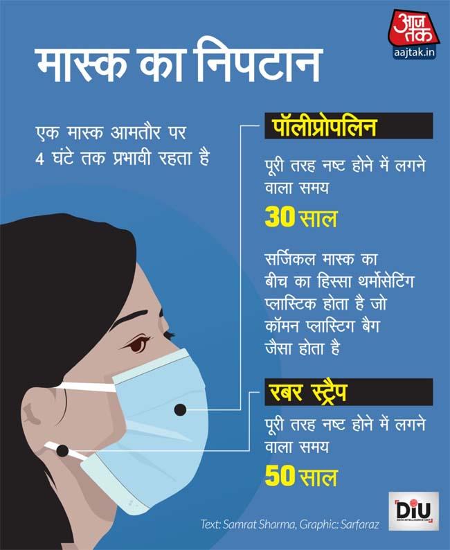 एक सामान्य मास्क बनाने में पॉलीप्रोपाइलीन और रबर का इस्तेमाल होता है. जहां पॉलीप्रोपाइलीन को सड़ने में लगभग 20-30 साल लगते हैं, वहीं रबर को अपना अस्तित्व पूरी तरह से खोने में 50 साल लगते हैं.