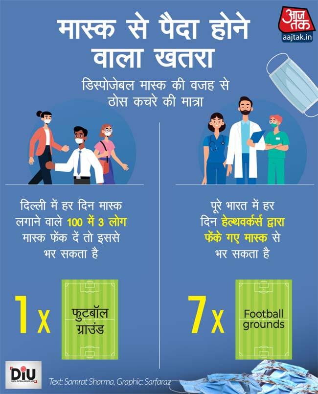 वर्ष 2020 में दिल्ली की अनुमानित आबादी को देखते हुए, जो कि यूआईडीएआई के अनुसार 1.87 करोड़ है, अगर राज्य के 100 में से 3 लोग हर 24 घंटे में अपने मास्क को डिस्पोज करते हैं तो यह हर दिन एक फुटबॉल मैदान को कवर कर सकता है.