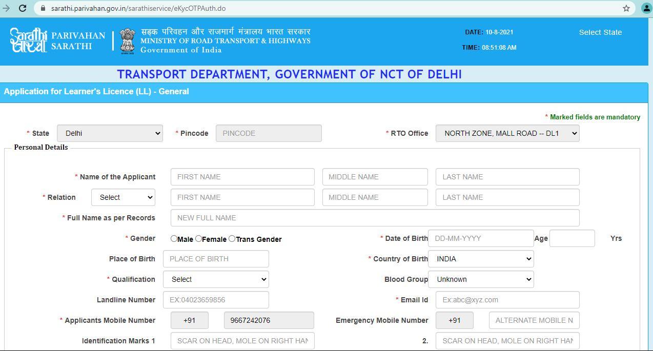 Learner's Licence के लिए फॉर्म वाले पेज पर निम्न जानकारियों को भरना होगा....