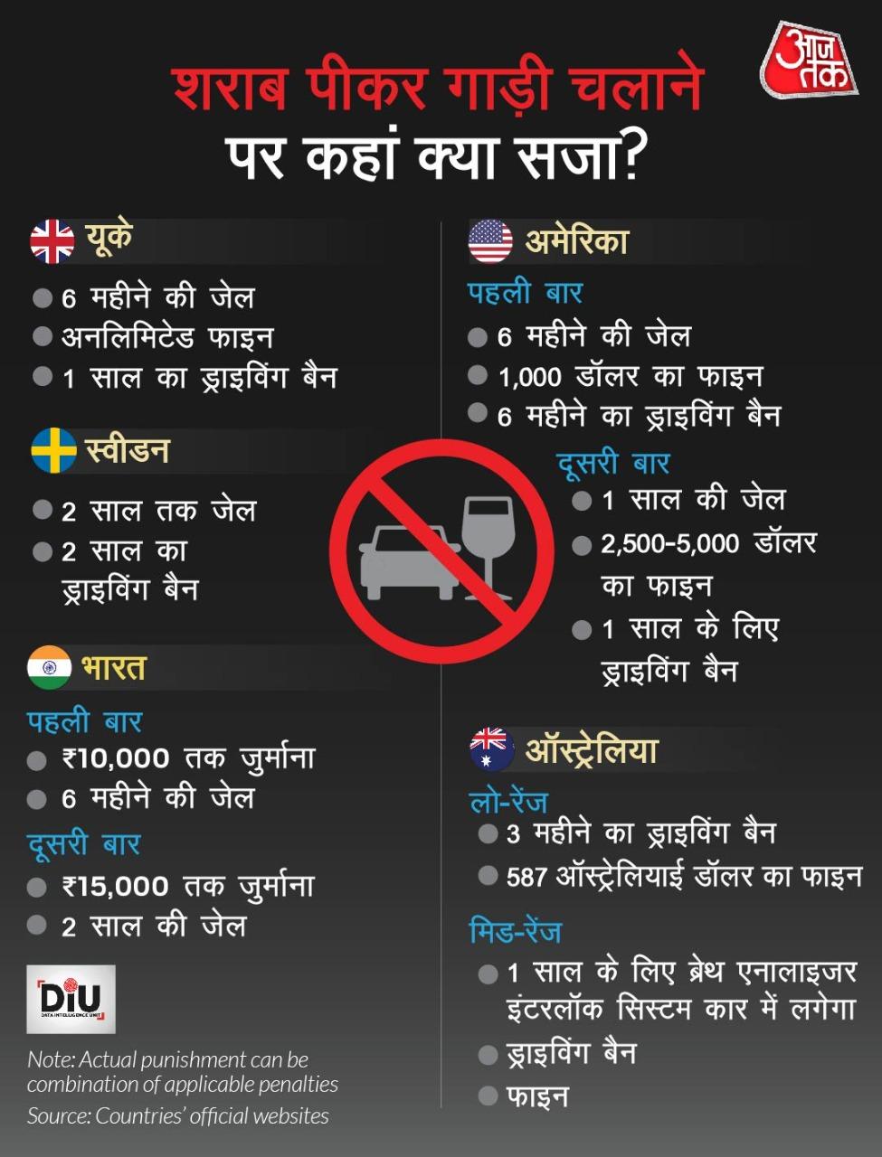 दुनिया के लगभग सभी देशों में शराब पीकर या नशे की हालत में गाड़ी चलाना अपराध है और ऐसा करने पर जुर्माना वसूला जा सकता है. यूके में जुर्माने की रकम तय नहीं है और सुनवाई के बाद जज अपराधी से कितना भी जुर्माना वसूल सकते हैं. वहीं, स्वीडन में दो साल तक की सजा हो सकती है. इतना ही नहीं, अगर गंभीर मामला है तो दो साल या उससे ज्यादा समय के लिए लाइसेंस भी फ्रीज हो जाता है.