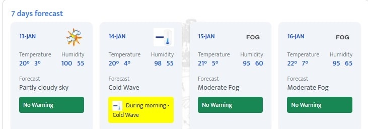 मौसम विभाग का पूर्वानुमान है कि 15 जनवरी तक यूपी, बिहार, मध्य प्रदेश, राजस्थान, हरियाणा, पंजाब और दिल्ली में कोल्ड वेव की स्थिति बनी रहेगा. फिर वेस्टर्न डिस्टर्बेंस के असर से पाला गिरने जैसे हालात बन सकते हैं. इस दौरान उत्तराखंड, हिमाचल प्रदेश, जम्मू-कश्मीर और लद्दाख के ऊंचाई वाले स्थानों पर बर्फबारी हो सकती है.