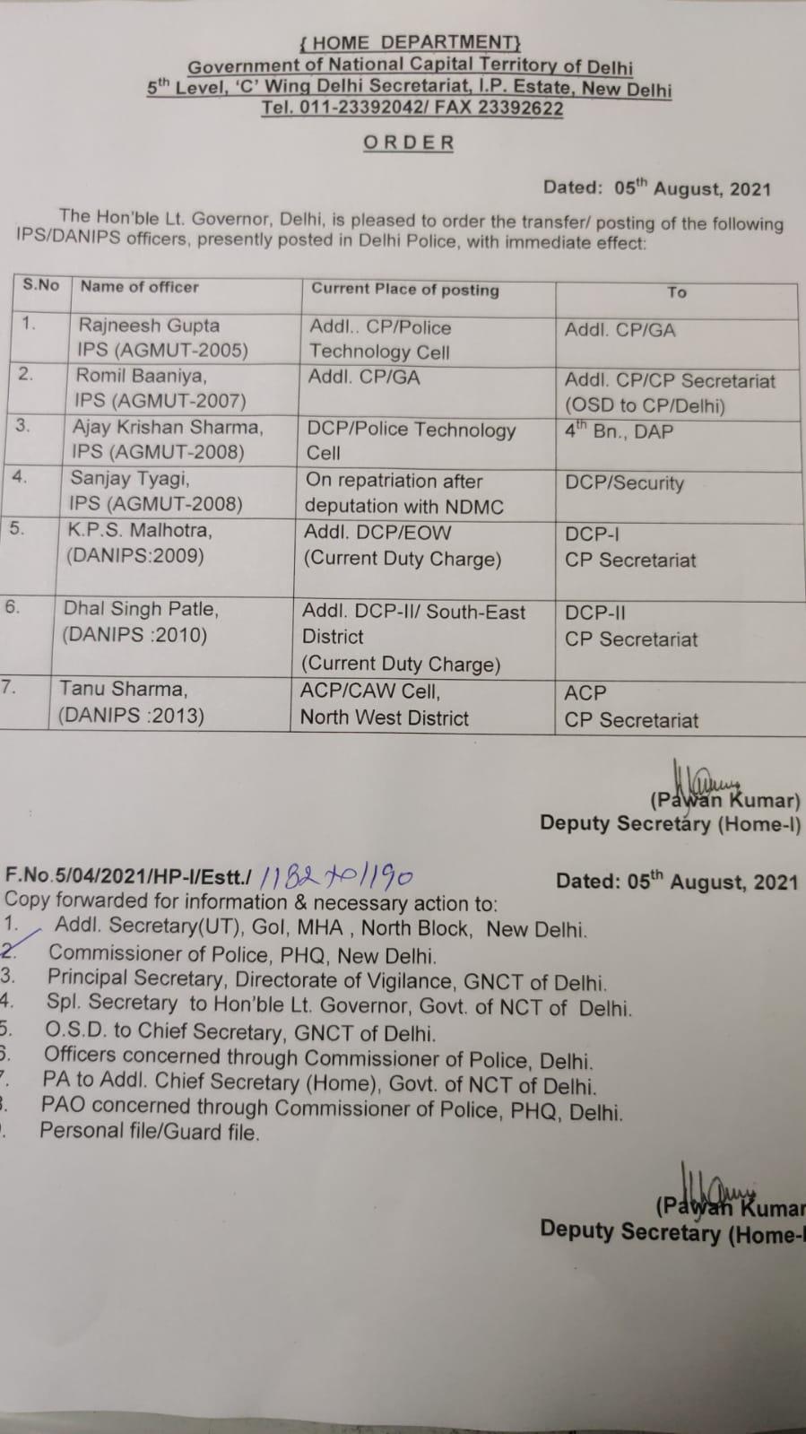 आईपीएस रोमिल बनिया को कमिश्नर का ओएसडी और एडिशनल सीपी सचिवालय बनाया गया है. केपीएस मल्होत्रा को डीसीपी 1 और ढाल सिंह पतले को डीसीपी 2 के तौर पर नियुक्त किया गया है. वहीं, तनु शर्मा को एसीपी बनाया गया है.