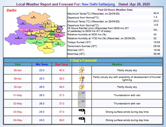 मौसम विभाग के ताजा अपडेट के मुताबिक, दिल्ली में आज आंशिक रूप से बादल छाए रहेंगे तथा गरज के साथ बिजली गिरने की संभावना है. इसके साथ ही न्यूनतम तापमान 25 डिग्री सेल्सियस और अधिकतम तापमान 39 डिग्री सेल्सियस रह सकता है. अगले दिन यानी 30 अप्रैल को भी मौसम ऐसा ही रहेगा.