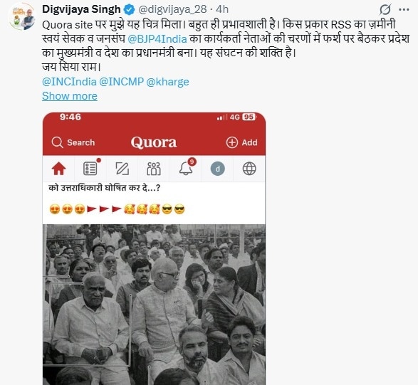 इस तस्वीर के साथ दिग्विजय सिंह ने लिखा, "Quora site पर मुझे यह चित्र मिला. बहुत ही प्रभावशाली है. किस प्रकार RSS का ज़मीनी स्वयं सेवक व जनसंघ @BJP4India का कार्यकर्ता नेताओं की चरणों में फर्श पर बैठकर प्रदेश का मुख्यमंत्री व देश का प्रधानमंत्री बना. यह संघटन की शक्ति है. जय सिया राम."