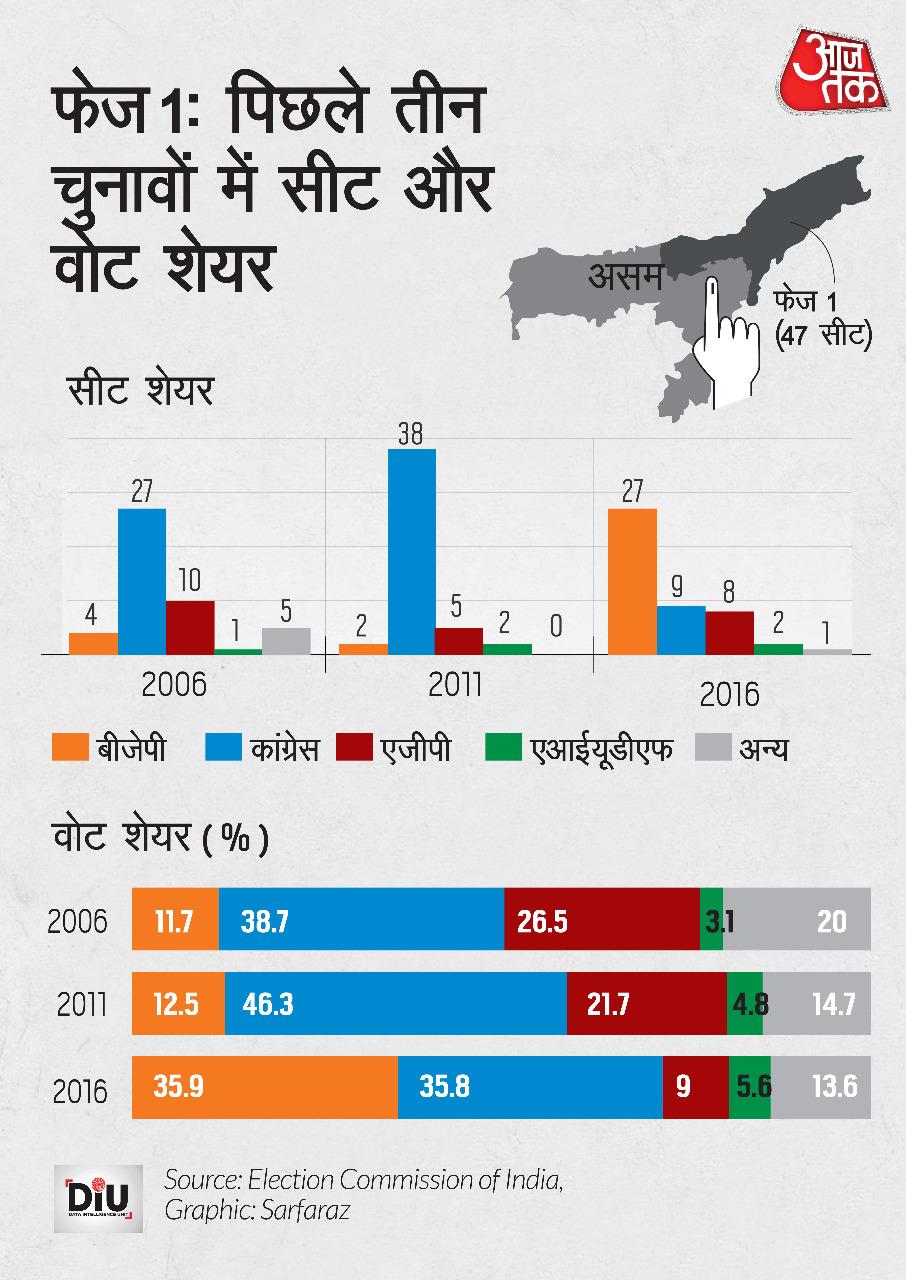 पहले चरण के तहत असम में जिन 47 सीटों पर मतदान होना है, वहां पर 2016 के विधानसभा चुनाव में बीजेपी गठबंधन ने कांग्रेस का सफाया कर दिया था. 5 साल पहले हुए विधानसभा चुनाव में बीजेपी ने 47 में से 27 और उसकी सहयोगी असम गण परिषद ने 8 सीटों पर कब्जा जमाया था. जबकि कांग्रेस के खाते में 9 सीटें गई थीं.