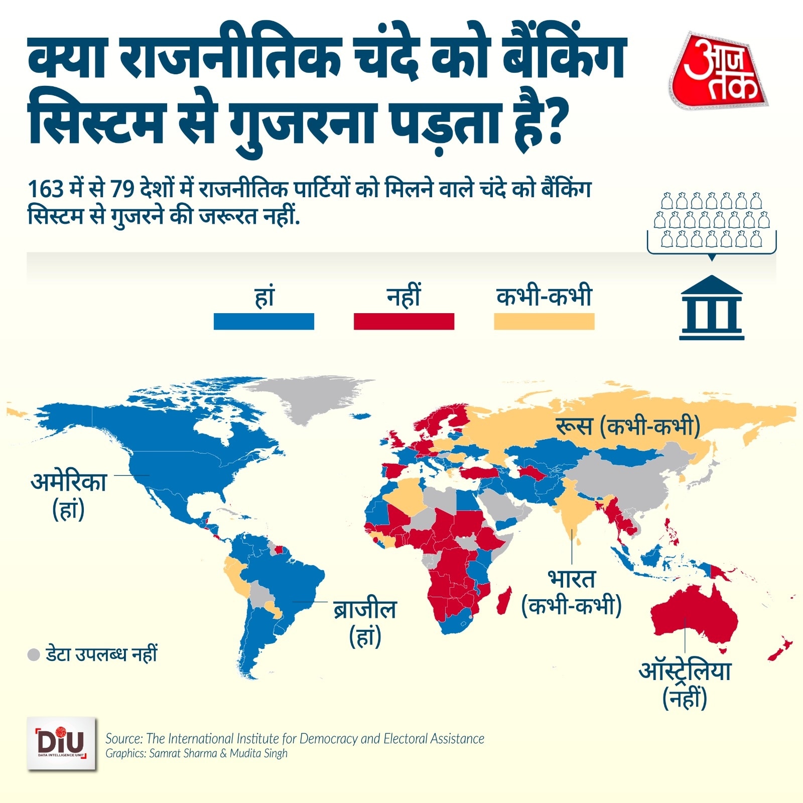 चूंकि राजनीतिक फंडिंग में दुरुपयोग की संभावना होती है, इसलिए फंड को औपचारिक बैंकिंग प्रक्रिया से गुजरना होगा. इंटरनेशनल इंस्टीट्यूट फॉर डेमोक्रेसी एंड इलेक्टोरल असिस्टेंस के अनुसार, 163 देशों में से 79 देशों में राजनीतिक फंड के लिए औपचारिक बैंकिंग प्रक्रिया से गुजरना जरूरी नहीं है, जबकि 67 देशों में यह अनिवार्य है. भारत और रूस समेत 17 देशों में राजनीतिक फंड कभी-कभी बैंकिंग प्रक्रिया के जरिए आते हैं.