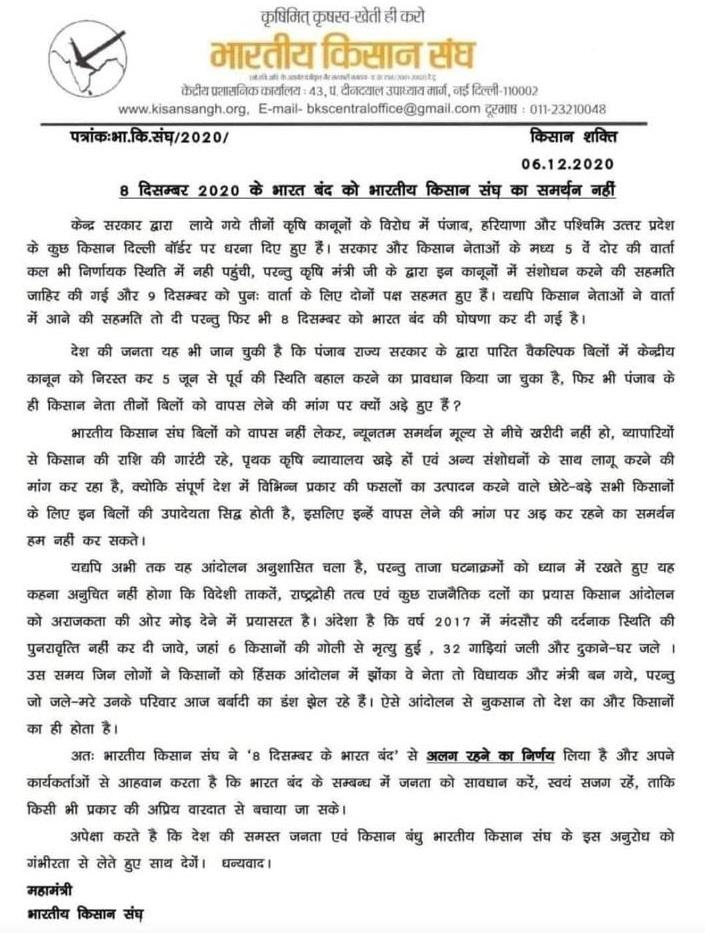 राष्ट्रीय स्वयंसेवक संघ से जुड़े भारतीय किसान संघ ने आठ दिसंबर को बुलाए गए भारत बंद से दूरी बना ली है. भारतीय किसान संघ का कहना है कि इस भारत बंद से दूरी इसलिए बनाई हैं क्योंकि इसमें राजनैतिक पार्टियां जुड़ गई हैं. भारतीय किसान संघ के मुताबिक, किसान संगठनों को लोकतांत्रिक ढंग से अपनी बात सरकार के सामने रखनी चाहिए. सरकार ने जो कृषि सम्बंधित तीन कानून बनाए हैं, उसमें तीन कमियां हैं जिसको लेकर हम सरकार पहलें से ज्ञापन दे चुके हैं.