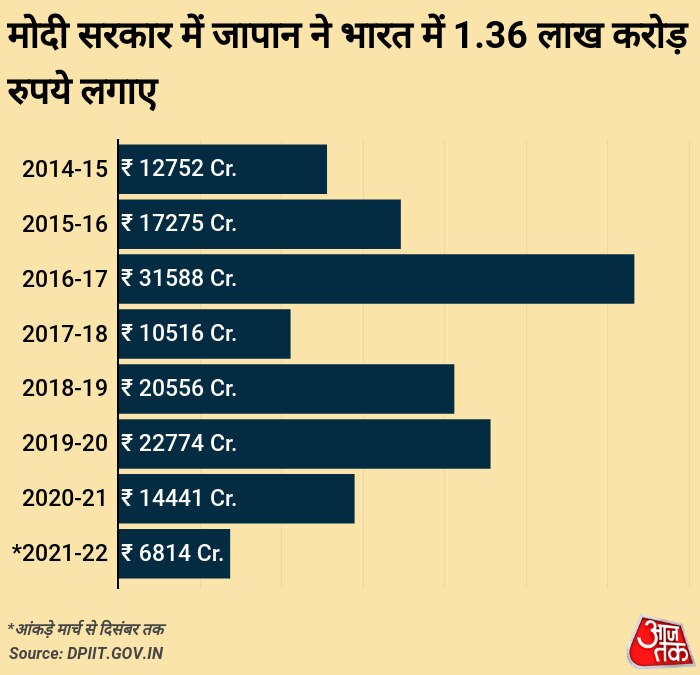 एक आंकड़ा ये भी है कि भारत के कुल विदेशी निवेश (FDI) में जापान की हिस्सेदारी लगातार कम हो रही है. एक समय जापान भारत में निवेश करने वाले देशों की लिस्ट में तीसरे नंबर पर हुआ करता था, आज 7वें नंबर पर है. जापान ने सबसे ज्यादा 31 हजार 588 करोड़ रुपये 2016-17 में निवेश किए थे. उस साल कुल FDI में जापान की हिस्सेदारी 10 फीसदी से भी ज्यादा थी. हालांकि, 2021-22 में जापान की ये हिस्सेदारी घटकर 2% पर आ गई है.