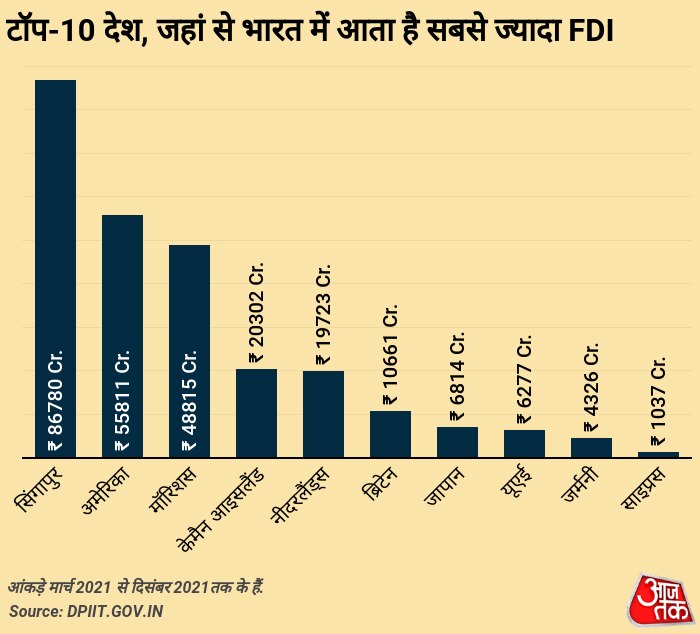 मिनिस्ट्री ऑफ कॉमर्स एंड इंडस्ट्री के FDI डेटा के मुताबिक, भारत में सबसे ज्यादा निवेश सिंगापुर करता है. 2021-22 में सिंगापुर ने भारत में 86 हजार 780 करोड़ रुपये का निवेश किया है. दूसरे नंबर पर अमेरिका है, जिसने 55 हजार 811 करोड़ रुपये निवेश किए.