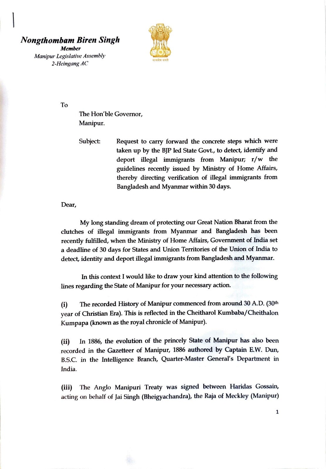 उन्होंने पत्र में कहा, 'मेरा लंबे समय से सपना रहा है कि हम अपने देश को अवैध प्रवासियों की समस्या से मुक्त करें.' उन्होंने अपने पत्र में मणिपुर के इतिहास का भी उल्लेख किया. उन्होंने बताया कि मणिपुर का इतिहास 30 ईस्वी (ईसवी सन्) से शुरू होता है, जैसा कि चीथारोल कुंबाबा (मणिपुर का शाही इतिहास) में दर्ज है. इसके अलावा 1886 में मणिपुर के राजकुमार राज्य के विकास में महत्वपूर्ण भूमिका निभाई, जैसा कि कैप्टन ई.डब्ल्यू. डन (बी.एस.सी.) ने गजेटियर ऑफ मणिपुर में उल्लेख किया है.