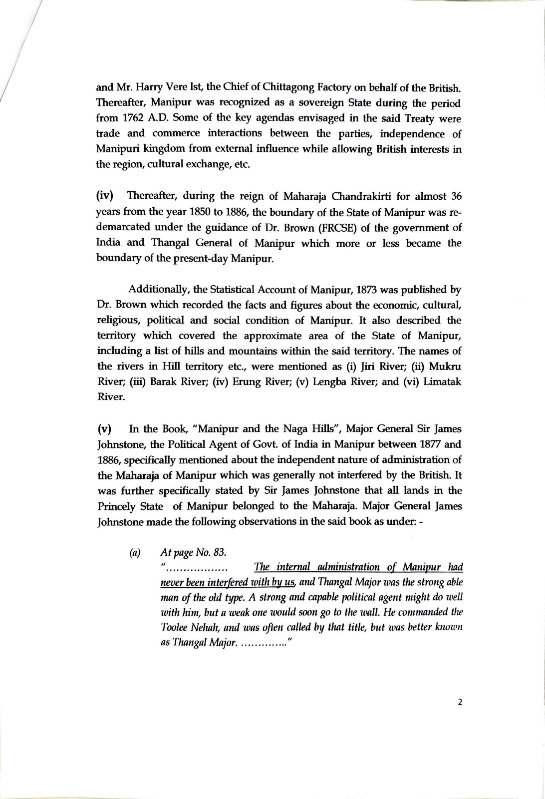 उन्होंने मेजर जनरल सर जेम्स जॉनस्टोन की किताब "मणिपुर एंड द नागा हिल्स" का हवाला देते हुए मणिपुर के प्रशासनिक इतिहास पर भी टिप्पणी की. जॉनस्टोन ने 1877 से 1886 के बीच मणिपुर में ब्रिटिश राजनीतिक एजेंट के रूप में कार्य किया था.