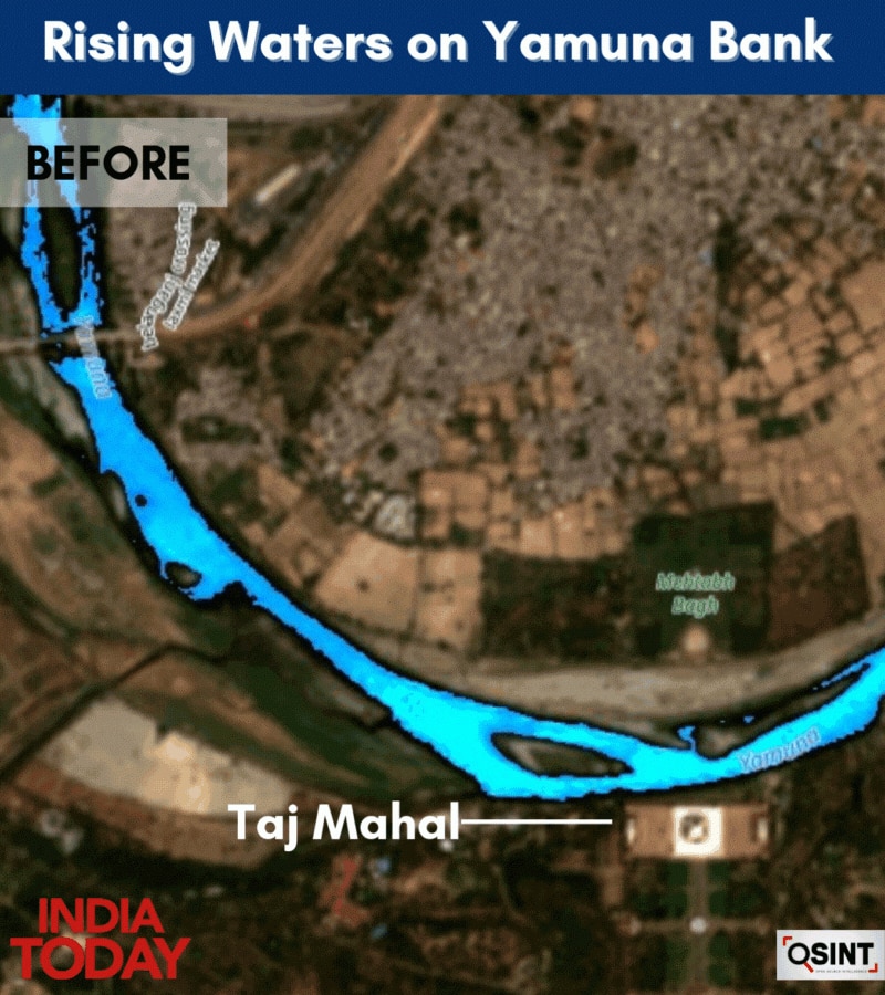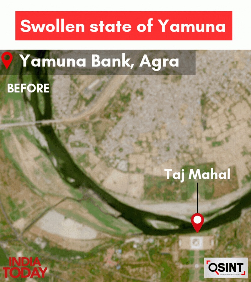 यमुना नदी का जलस्तर तेजी से बढ़ रहा है और दिल्ली, मथुरा से लेकर आगरा तक कई निचले इलाकों में बाढ़ जैसे हालात बन गए हैं. अगर जलस्तर इसी तरह बढ़ता रहा, तो हालात 2023 जैसे हो सकते हैं, जब बाढ़ का पानी ताजमहल की बाहरी दीवारों तक पहुंच गया था. सैटेलाइट तस्वीरों में साफ दिख रहा है कि ताजमहल के पीछे बहने वाला यमुना का इलाका 193 मीटर से बढ़कर 558 मीटर तक फैल गया है.