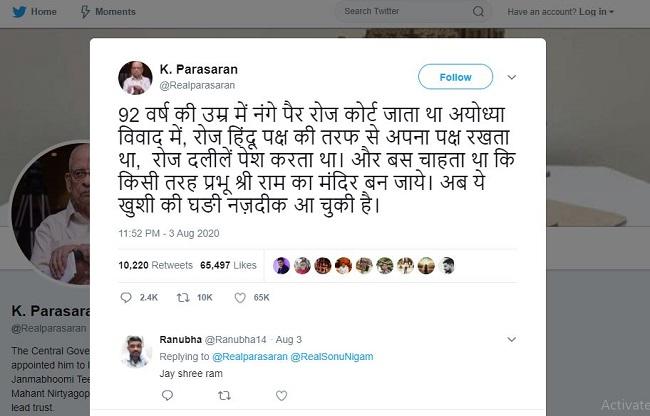 इस साल 5 अगस्त के नजदीक आते ही अयोध्या में भूमि पूजन से संबंधित समाचार सुर्खियों में छाने लगे थे. भारत के पूर्व अटॉर्नी जनरल और भारत के टॉप लीगल माइंड्स मे से एक माने जाने वाले, 92 वर्षीय के परासरन जिन्हें सुप्रीम कोर्ट में कानूनी लड़ाई का नेतृत्व करने और जीतने का श्रेय दिया जा रहा था, अचानक, उनके नाम का इस्तेमाल करते हुए एक नया ट्विटर अकाउंट (@Realparasaran) सामने आया और खुद को वरिष्ठ वकील का प्रतिनिधित्व करते दिखाने का भ्रम दिया. इस अकाउंट से शुरुआती ट्वीट्स 10 हजार से अधिक रीट्वीट्स हासिल करने में सफल रहे. यह सुशांत सिंह राजपूत की बहन होने का दिखावा करने वाले अकाउंट के बाद किसी जाने पहचाने शख्स के नाम से दूसरा फर्जी अकाउंट था.