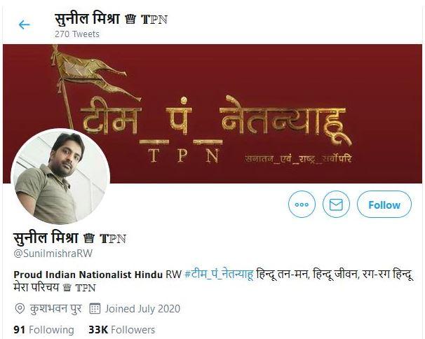 ट्विटर हैंडल @SunilmisraRW खुद को "प्राउड इंडियन नेशनलिस्ट हिंदू आरडब्ल्यू" और टीम_पं_नेतन्याहू का सदस्य बताता है.