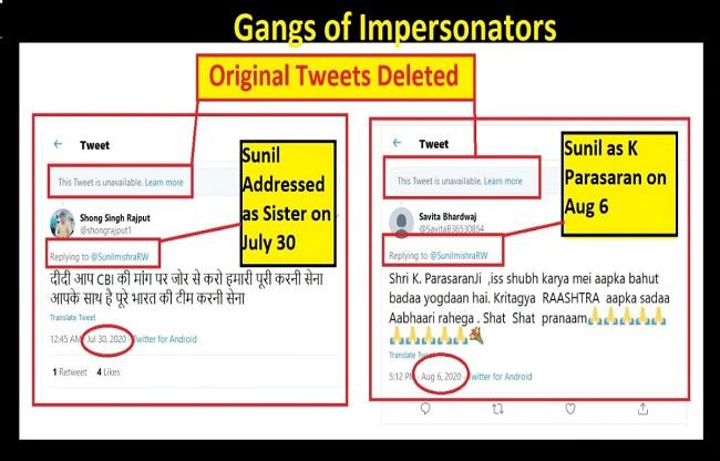 30 जून को किए गए इस ट्वीट में (जब यह अकाउंट सुशांत की बहन का होने का स्वांग कर रहा था), एक व्यक्ति सुनील को दीदी (बहन) कहते हुए जवाब देता है, जबकि मूल ट्वीट, नष्ट हो चुका है. इसी तरह 6 अगस्त को पोस्ट किए गए ट्वीट में, मौजूदा वक्त का सुनील खुद को के परासरन बता रहा था, यानि वरिष्ठ वकील के परासरन का स्वांग कर आभासी जिंदगी जी रहा था.