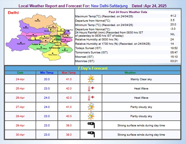राजधानी दिल्ली के लिए मौसम विभाग ने आज यानी 25 अप्रैल के लिए लू का अलर्ट जारी किया है. यहां न्यूनतम तापमान 23 डिग्री सेल्सियस तो अधिकतम तापमान 42 डिग्री सेल्सियस पहुंच सकता है. अगले दिन 26 अप्रैल को भी लू चलने की संभावना है. हालांकि इसके बाद से कुछ राहत मिलने के आसार हैं.