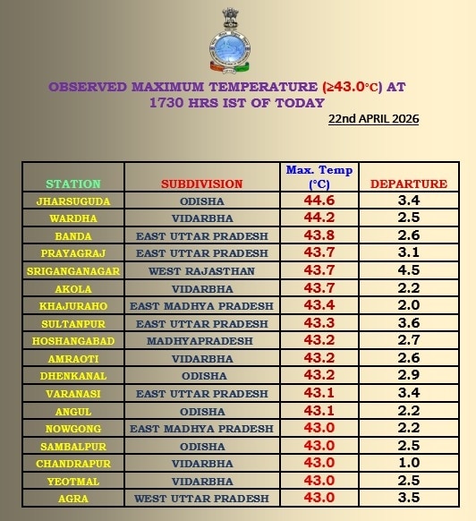 अप्रैल के महीने में भारत में भीषण गर्मी पड़ रही है. लू और हीटवेव ने लगभग आधे से अधिक देश को अपनी चपेट में ले लिया है. उत्तर प्रदेश से लेकर ओडिशा तक लोग लू के थपेड़ों से परेशान हैं. भारत मौसम विज्ञान विभाग (IMD) के अनुसार, कई जगहों पर तापमान 44 डिग्री सेल्सियस के पार पहुंच गया है. ओडिशा के झारसुगुड़ा शहर में बीते दिन यानी 22 अप्रैल को 44.6 डिग्री तापमान दर्ज किया गया, जो इन दिनों देश का सबसे ज्यादा है.